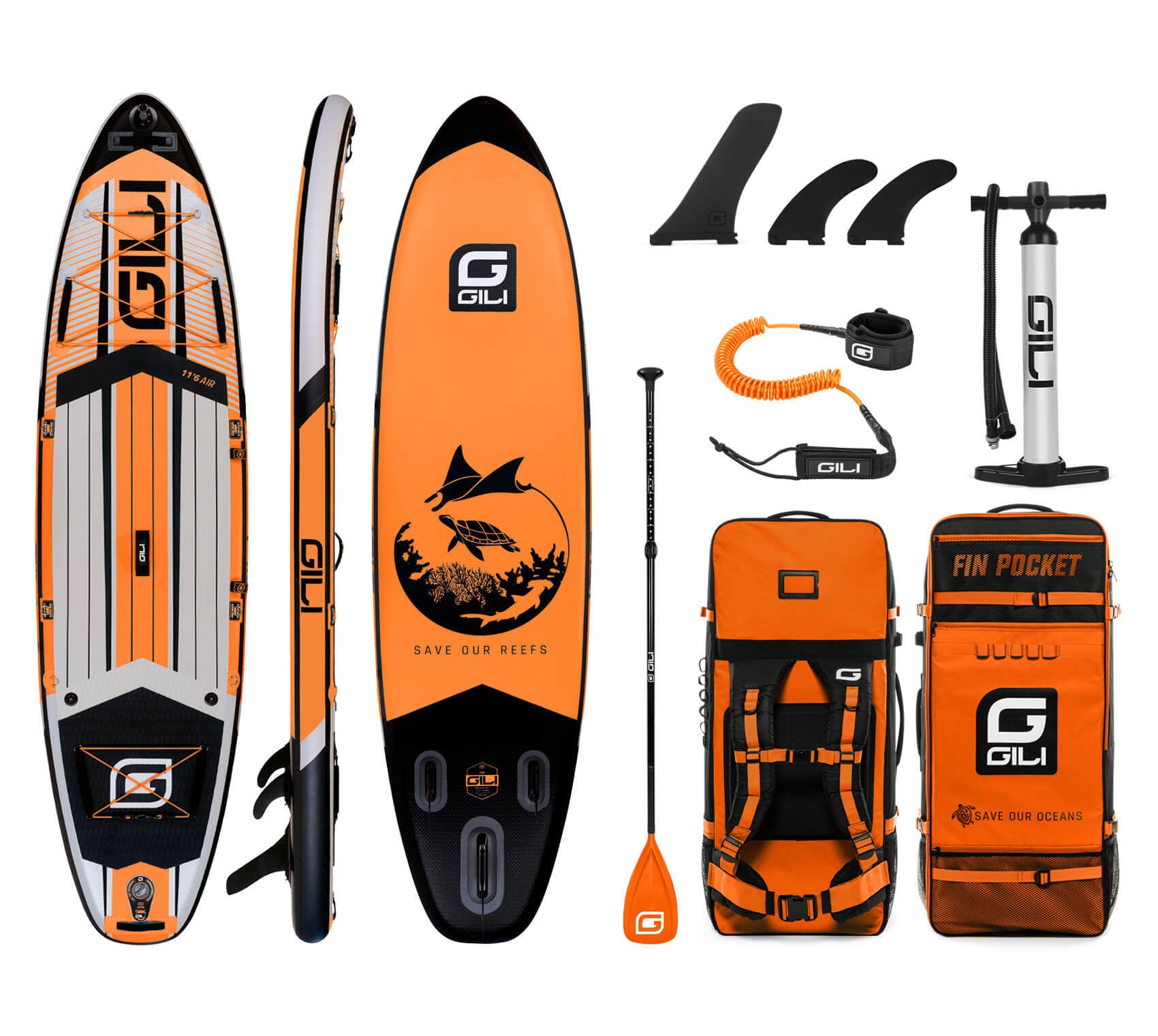 Complete iSUP Package: includes GILI Air SUP, Aluminum Travel Paddle, Inflatable Backpack, 2-Stage Hand Pump, 8' Coiled Leash, Snap-In Center Fin, Repair Kit