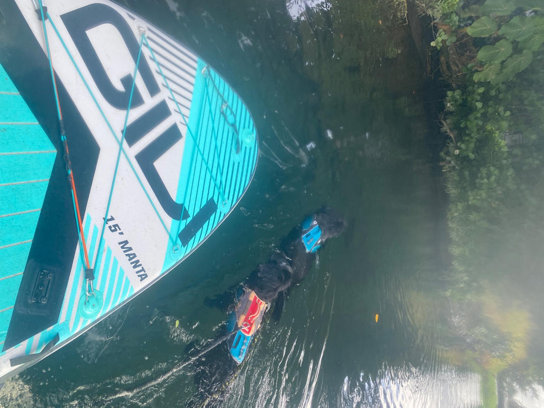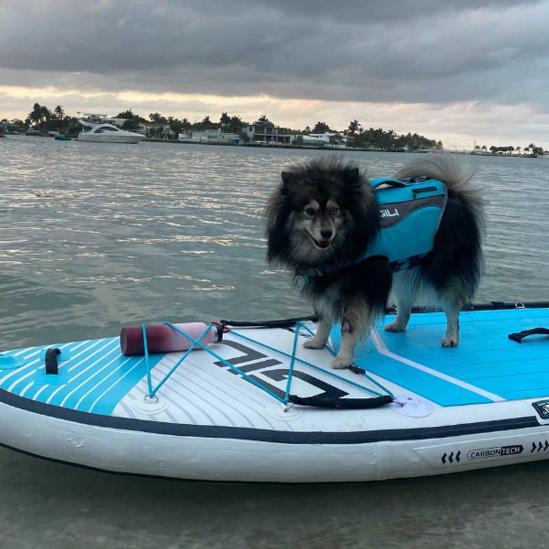 You haven't met a dog with attitude until you've met Mr. Wolf - if he doesn't like something, his side eye will tell you everything you need to know. Naturally, I was a bit worried about how he would deal with a dog PFD, but he didn't mind it at all! He could lay down, get up, move around the board, and snuffle on land with full range of motion. It's easy to put on, stays secure, and the grab handle is perfect for loading/unloading Wolf onto the SUP. 5/5 stars, 100% recommend for aquatic canines!