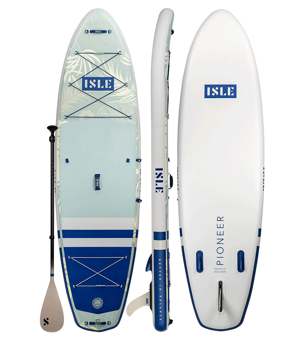 The ISLE Pioneer inflatable SUP is a reliable board for SUP surfing. Its wide nose and tail provide excellent stability while the three-fin setup helps with maneuverability on the waves.